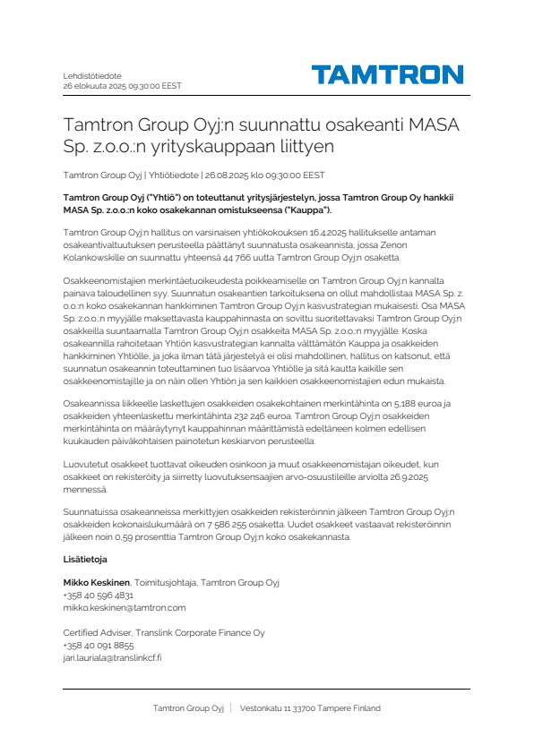 Tamtron Group Oyj (”Yhtiö”) on toteuttanut yritysjärjestelyn, jossa Tamtron Group Oy hankkii MASA Sp. z.o.o.:n koko osakekannan omistukseensa (”Kauppa”).